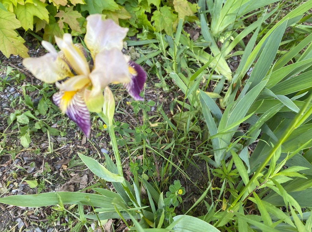 Currently, I have one flower in bloom and it’s an Iris. I despise it, loathe entirely! And the same one pops up every year beside the garage; it’s the bane of my gardening existence. It grows right from the gravel, not even in a garden.