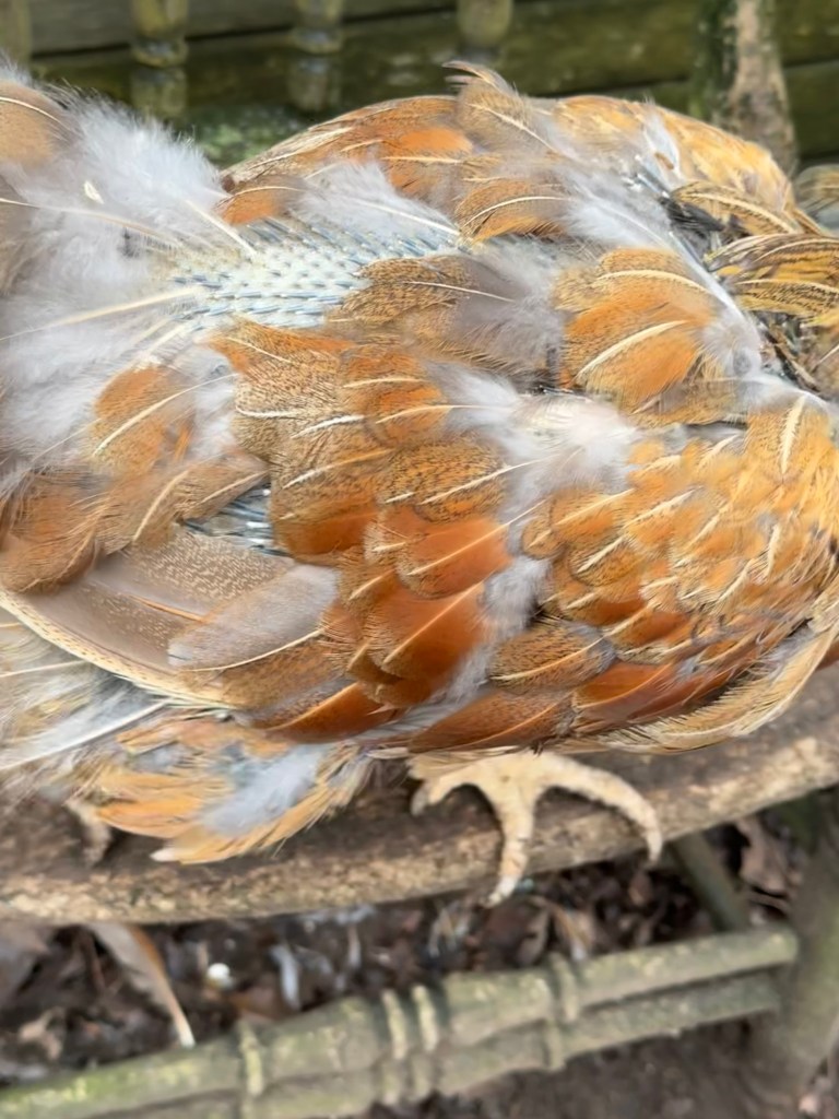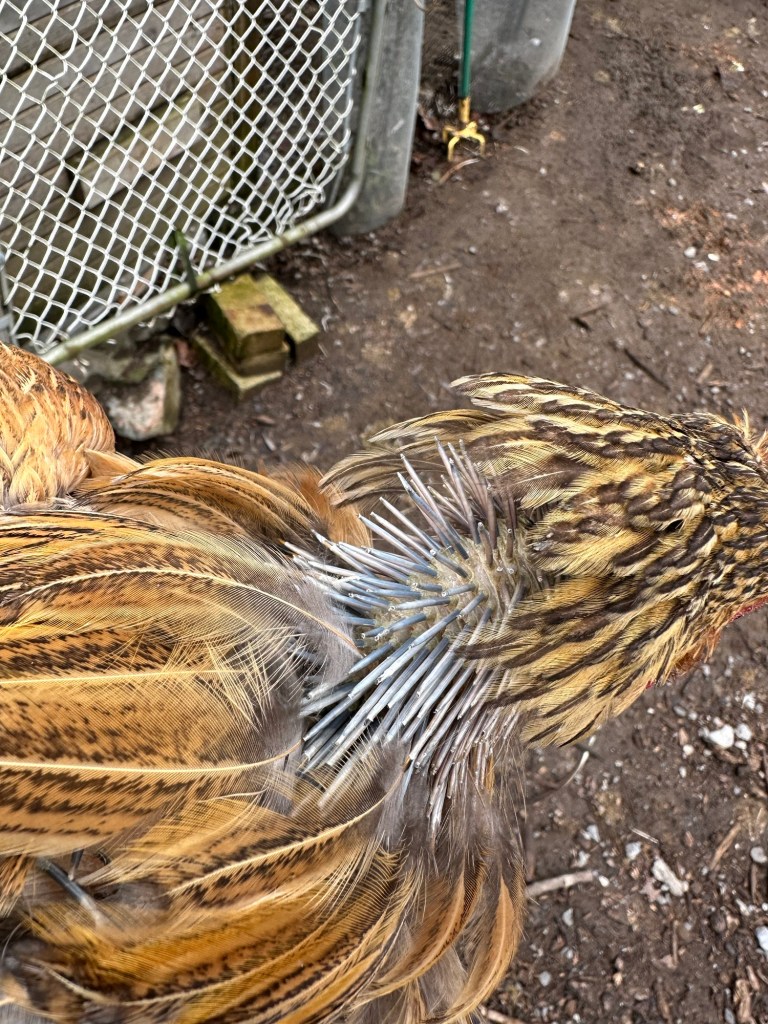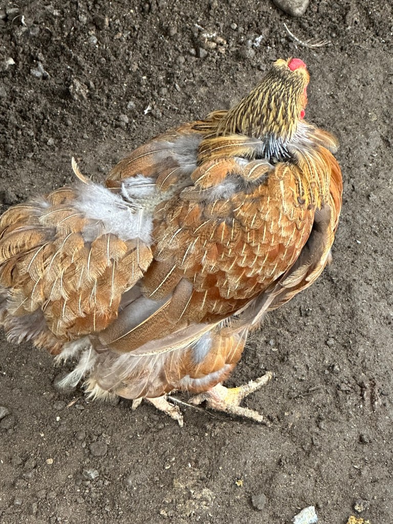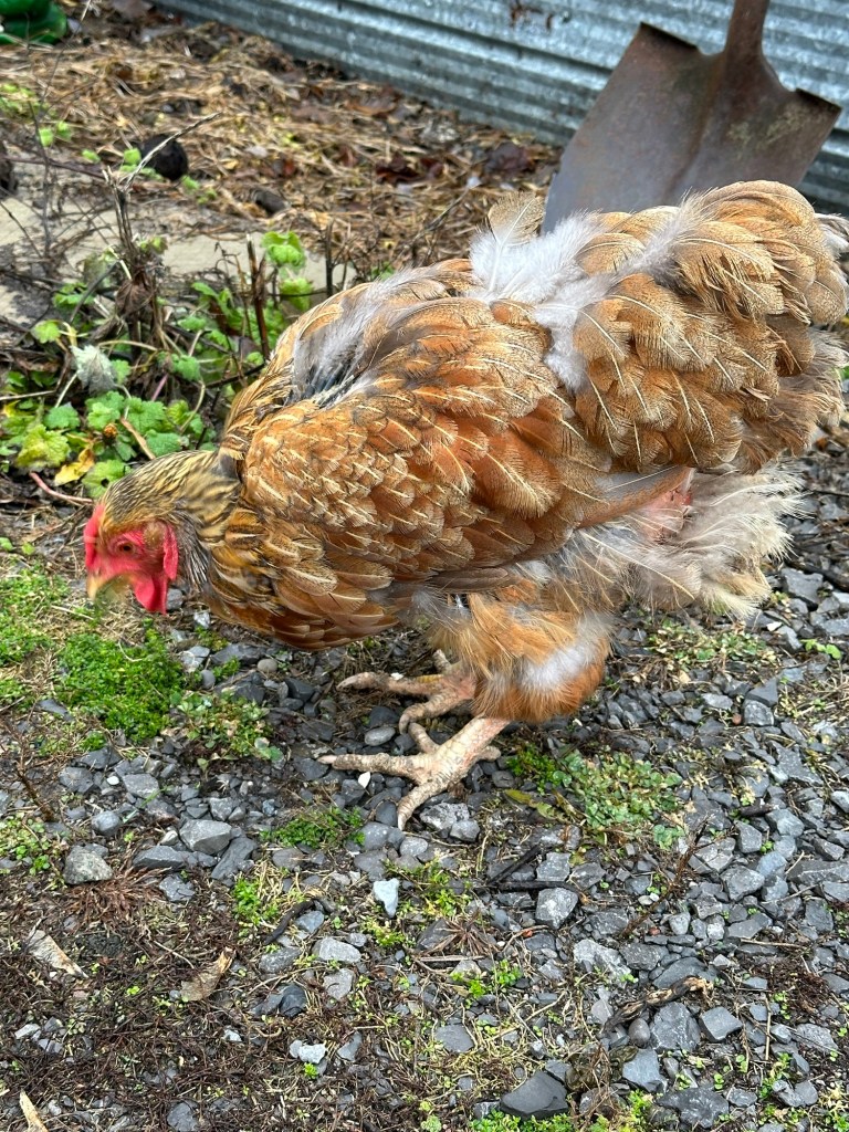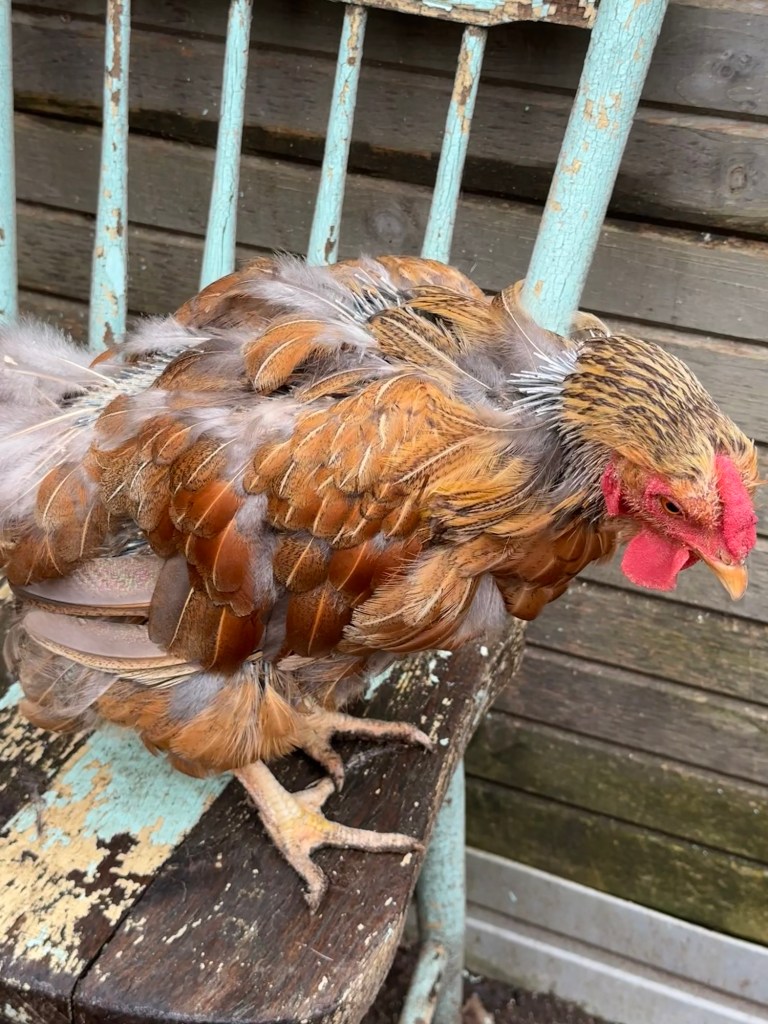 Poor old girl, about 60% of her is bald with tufts of old features here and there (and losing more feathers by the day!). Aside from her wings and head, she is pretty much naked.